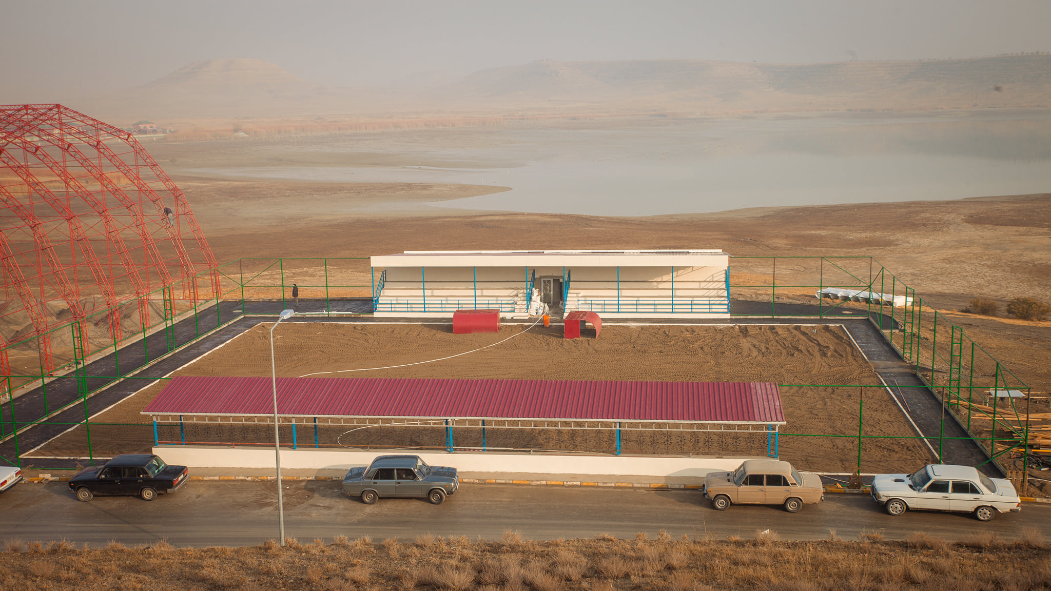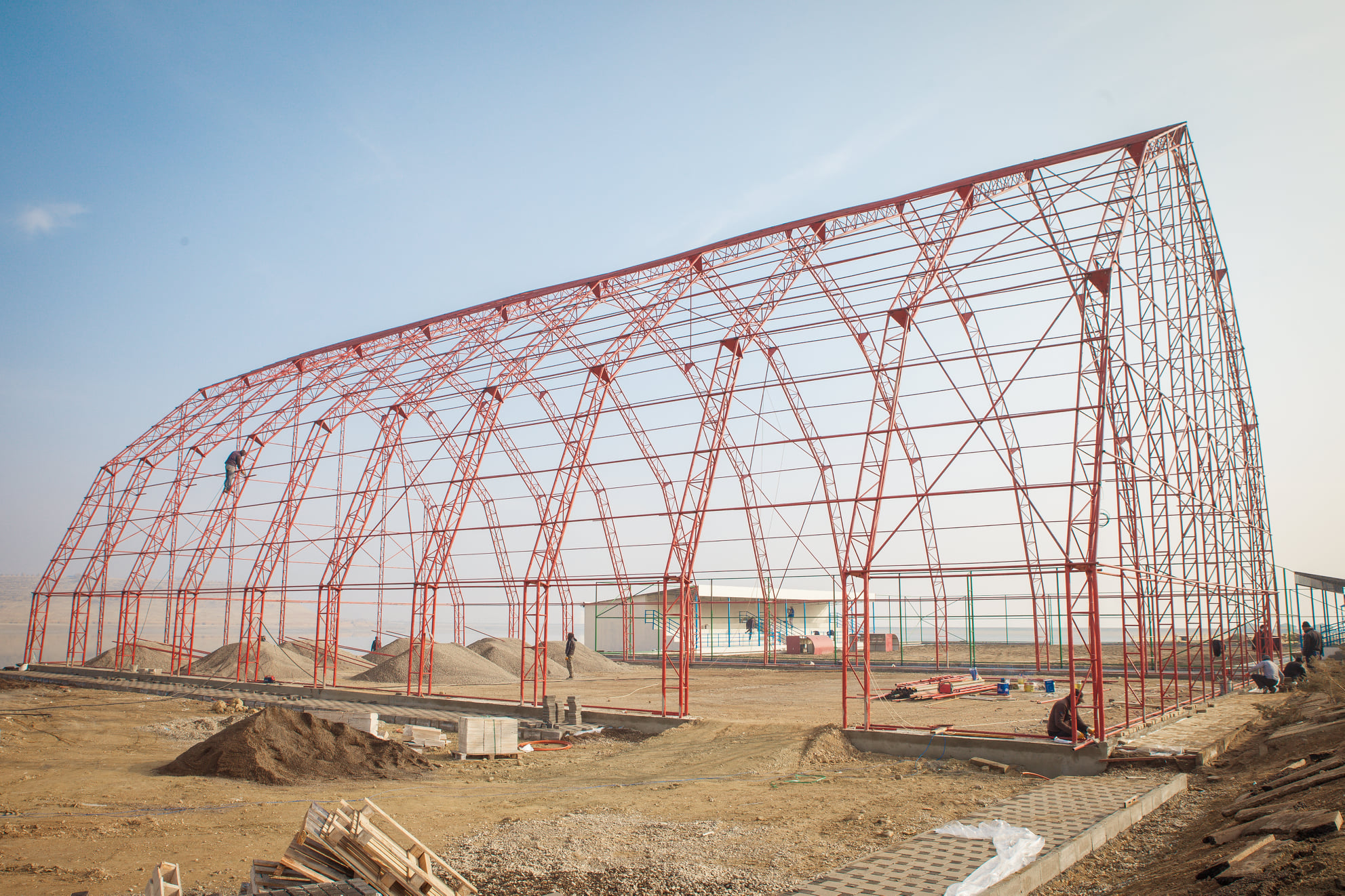 Üstüörtülü meydançanın əsasını təşkil edən metal konstruksiya quraşdırılması işi tam yekunlaşıb. Kompleksin ən böyük ərazisini əhatə edən süni örtüklü stadion və mini-futbol meydançası hasara alınıb, su-kanalizasiya xətləri çəkilib.
