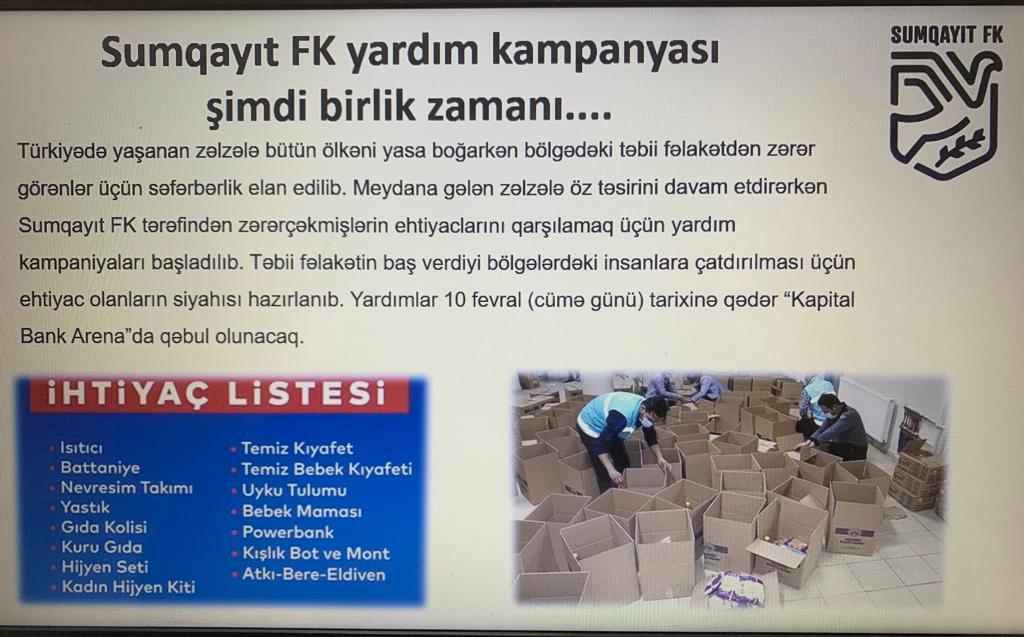Zəlzələ qurbanlarına dəstək olmaq istəyən şəxslər gücləri çatan əşyaları, geyim və yatacaqları klubun "Kapital Bank Arena"da yerləşən anbarına gətirib təhvil verir.